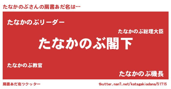 | 男性向けラノベタイトル風あだ名 | 『Re:たなかのぶから始める異世界生活』 |