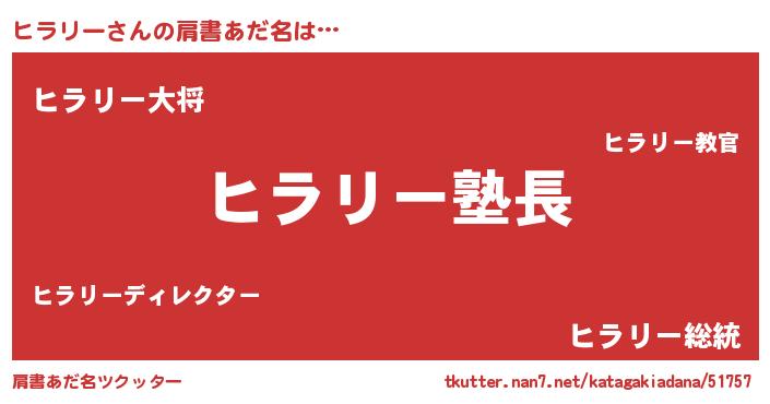 | 男性向けラノベタイトル風あだ名 | 『ダンジョンにヒラリーを求めるのは間違っているだろうか』 |