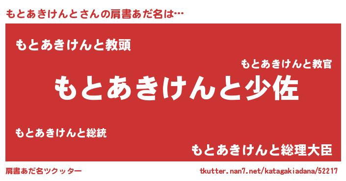 | 男性向けラノベタイトル風あだ名 | 『もとあきけんと~年齢イコール彼女いない歴の魔法使い~』 |
