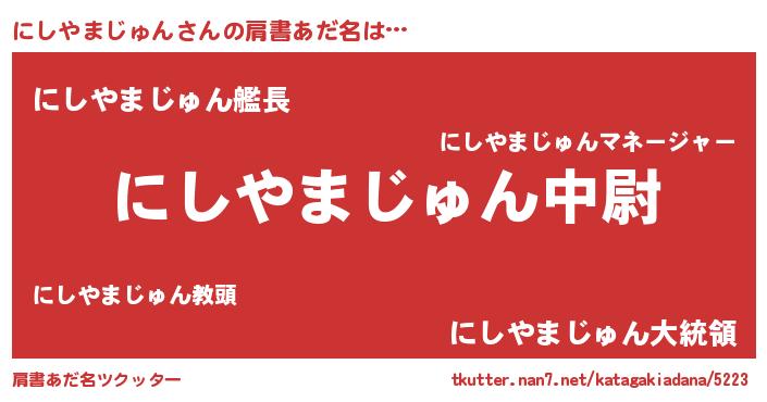 | 女子向けラノベタイトル風あだ名 | 『にしやまじゅんの玉の輿計画!』 |