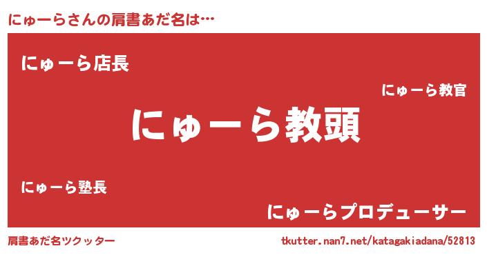 | 男性向けラノベタイトル風あだ名 | 『にゅーらという概念が存在しない退屈な世界 』 |