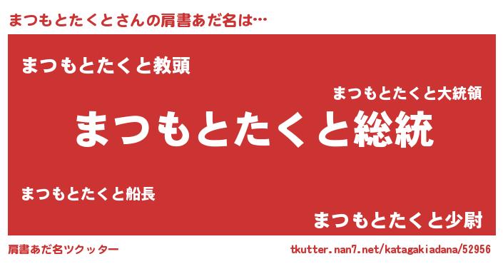 | 男性向けラノベタイトル風あだ名 | 『Re:まつもとたくとから始める異世界生活』 |
