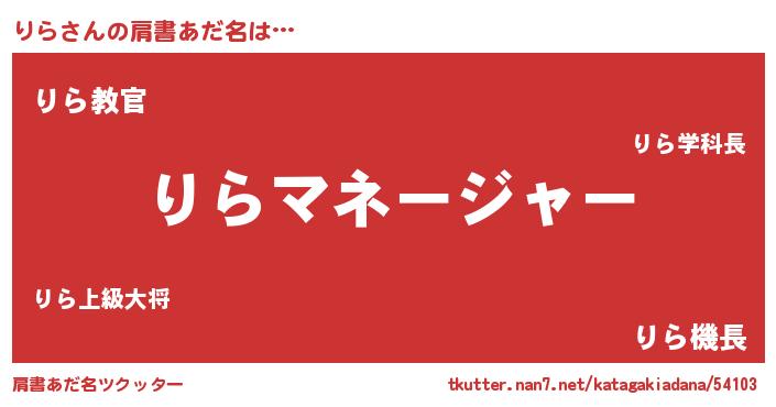 | 意味不明あだ名 | 『住所不定無職りら(5歳)』『自称りら』 |