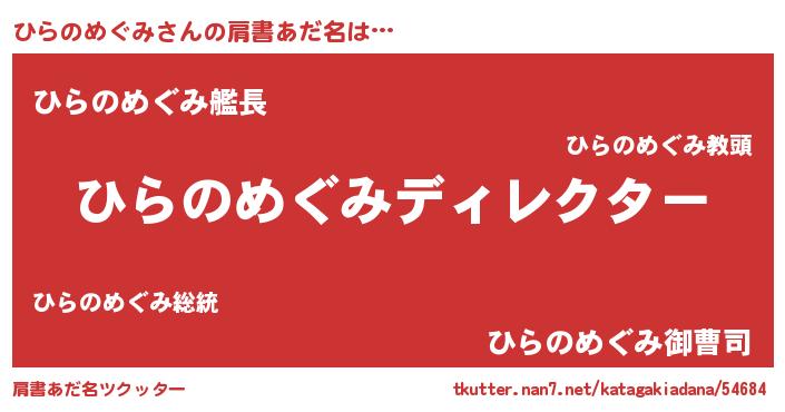 | 男性向けラノベタイトル風あだ名 | 『ひらのめぐみに滅ぼされるだけの簡単なお仕事です』 |