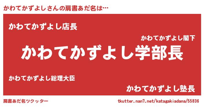| 男性向けラノベタイトル風あだ名 | 『ノーゲーム・ノーカワテカズヨシ』 |