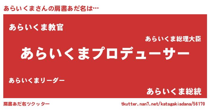 | 男性向けラノベタイトル風あだ名 | 『あらいくまに滅ぼされるだけの簡単なお仕事です』 |