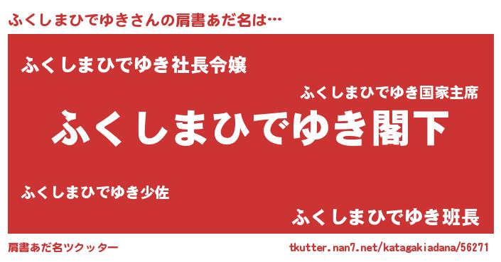 | 男性向けラノベタイトル風あだ名 | 『Re:ふくしまひでゆきから始める異世界生活』 |