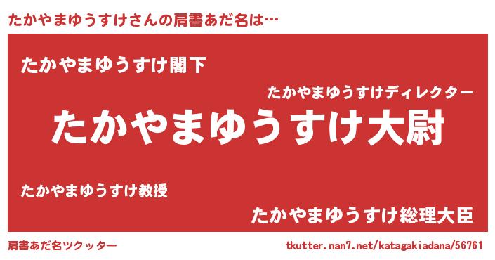 | 男性向けラノベタイトル風あだ名 | 『たかやまゆうすけ~年齢イコール彼女いない歴の魔法使い~』 |