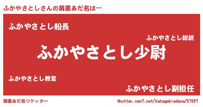 | 男性向けラノベタイトル風あだ名 | 『転生したらふかやさとしだった件』 |