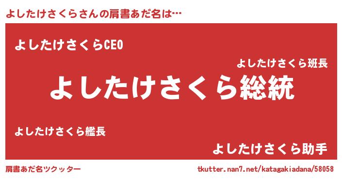 | 女子向けラノベタイトル風あだ名 | 『よしたけさくらストレイドッグス』 |