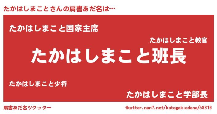 | 男性向けラノベタイトル風あだ名 | 『たかはしまことの嫁は女の子じゃないと思った?』 |