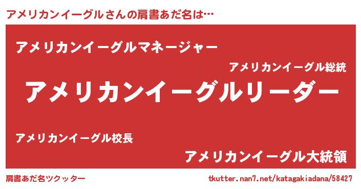| 男性向けラノベタイトル風あだ名 | 『アメリカンイーグルの嫁は女の子じゃないと思った?』 |