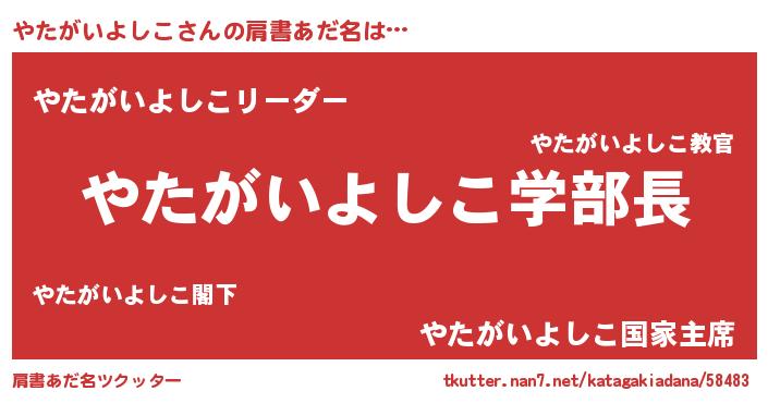 | ポケモン風あだ名 | 『ヤックウザ』『ヒヤタガイヨシコ』 |