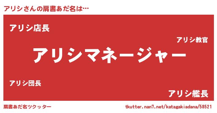 | 男性向けラノベタイトル風あだ名 | 『はたらくアリシさま!』『アリシの憂鬱』 |