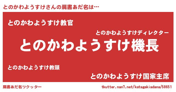 | 意味不明あだ名 | 『住所不定無職とのかわようすけ(81歳)』 |