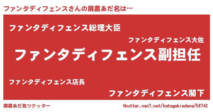 | 男性向けラノベタイトル風あだ名 | 『ファンタディフェンスという概念が存在しない退屈な世界 』 |