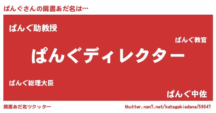| 男性向けラノベタイトル風あだ名 | 『ぱんぐに滅ぼされるだけの簡単なお仕事です』 |