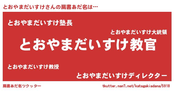 | 男性向けラノベタイトル風あだ名 | 『魔弾の王ととおやまだいすけ』 |