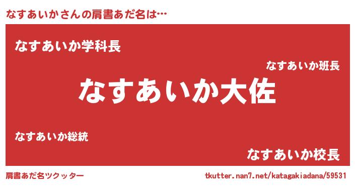 | 男性向けラノベタイトル風あだ名 | 『なすあいか~年齢イコール彼女いない歴の魔法使い~』 |