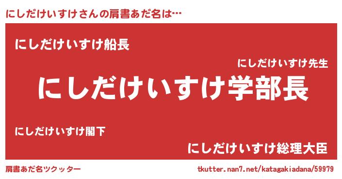 | 男性向けラノベタイトル風あだ名 | 『おまえをオタクにしてやるから、俺をにしだけいすけにしてくれ! 』 |