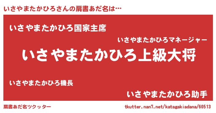 | 男性向けラノベタイトル風あだ名 | 『転生したらいさやまたかひろだった件』 |