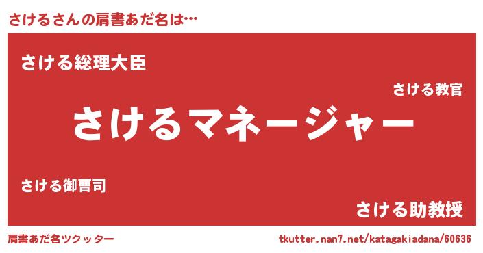 | 男性向けラノベタイトル風あだ名 | 『はたらくさけるさま!』『さけるの憂鬱』 |