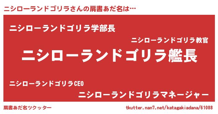| 男性向けラノベタイトル風あだ名 | 『うちのニシローランドゴリラが世界を掌握している!』 |