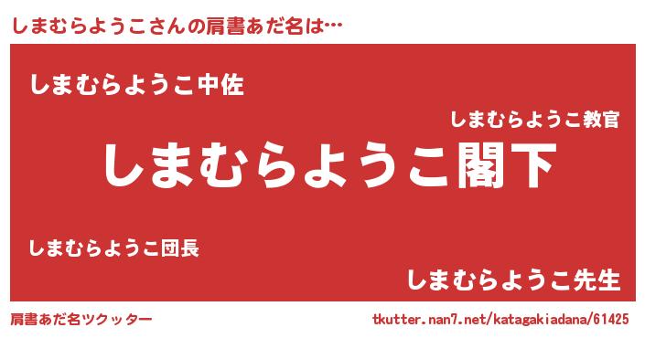 | 男性向けラノベタイトル風あだ名 | 『Re:しまむらようこから始める異世界生活』 |