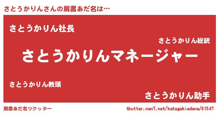 | 男性向けラノベタイトル風あだ名 | 『さとうかりんに滅ぼされるだけの簡単なお仕事です』 |
