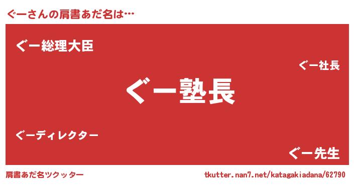 | 女子向けラノベタイトル風あだ名 | 『ぐーは平凡を望む』『ぐーの雑貨屋さん』 |