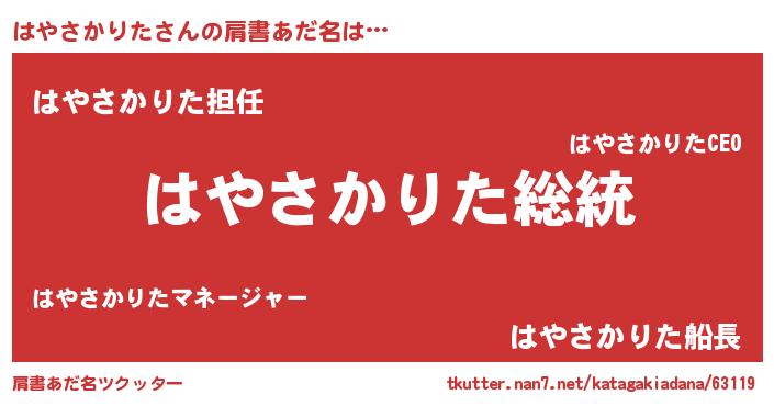| 男性向けラノベタイトル風あだ名 | 『Re:はやさかりたから始める異世界生活』 |