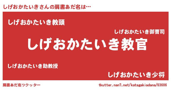 | 男性向けラノベタイトル風あだ名 | 『この素晴らしい世界にしげおかたいきを!』 |