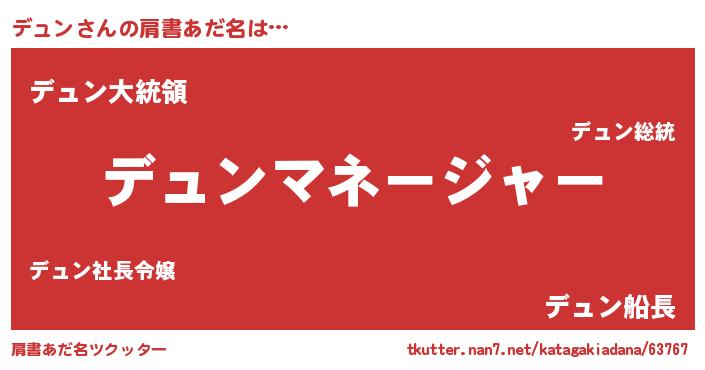 | 男性向けラノベタイトル風あだ名 | 『デュンに滅ぼされるだけの簡単なお仕事です』 |