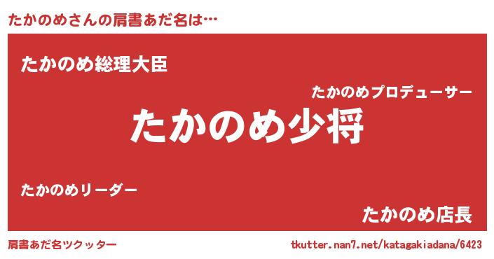 | 男性向けラノベタイトル風あだ名 | 『たかのめ~年齢イコール彼女いない歴の魔法使い~』 |