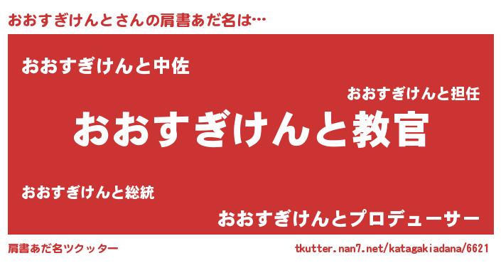 | 男性向けラノベタイトル風あだ名 | 『この素晴らしい世界におおすぎけんとを!』 |