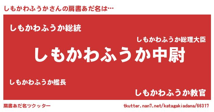 | 女子向けラノベタイトル風あだ名 | 『しもかわふうかの玉の輿計画!』 |