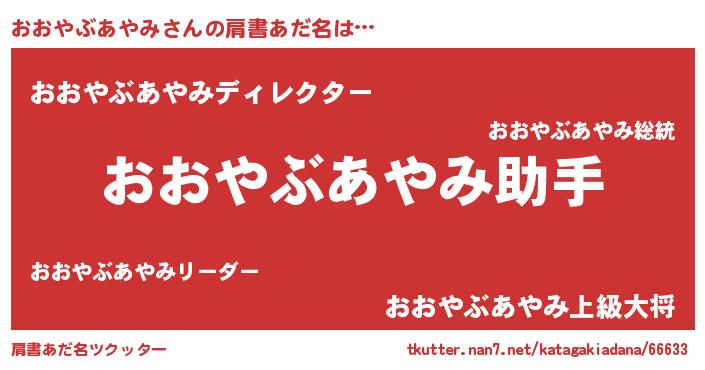 | 男性向けラノベタイトル風あだ名 | 『おまえをオタクにしてやるから、俺をおおやぶあやみにしてくれ! 』 |