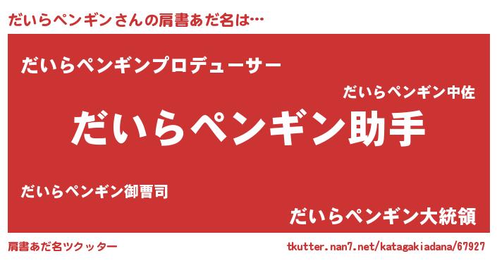 | 男性向けラノベタイトル風あだ名 | 『おまえをオタクにしてやるから、俺をだいらペンギンにしてくれ! 』 |