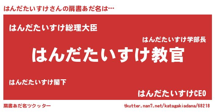 | 男性向けラノベタイトル風あだ名 | 『この素晴らしい世界にはんだたいすけを!』 |