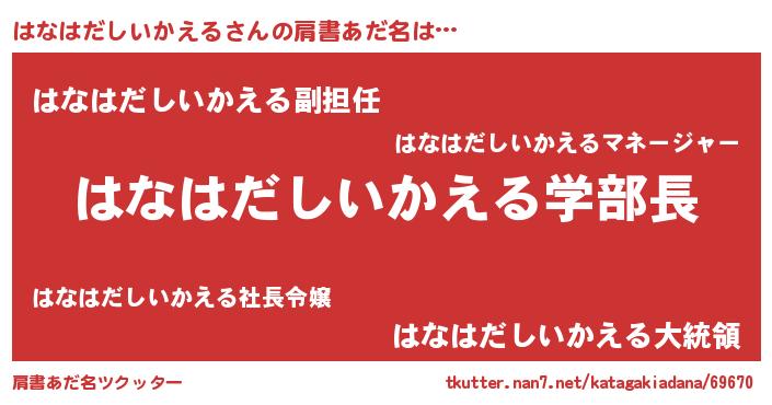 | 男性向けラノベタイトル風あだ名 | 『おまえをオタクにしてやるから、俺をはなはだしいかえるにしてくれ! 』 |