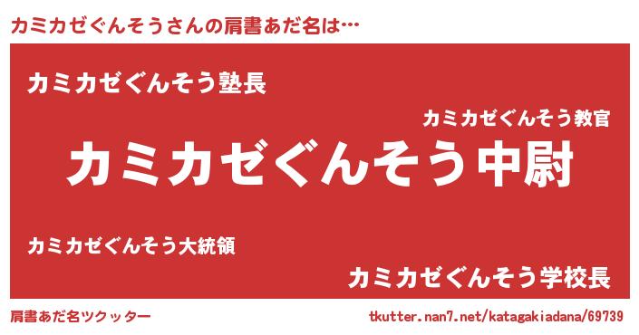 | 男性向けラノベタイトル風あだ名 | 『カミカゼグンソウスレイヤー』 |
