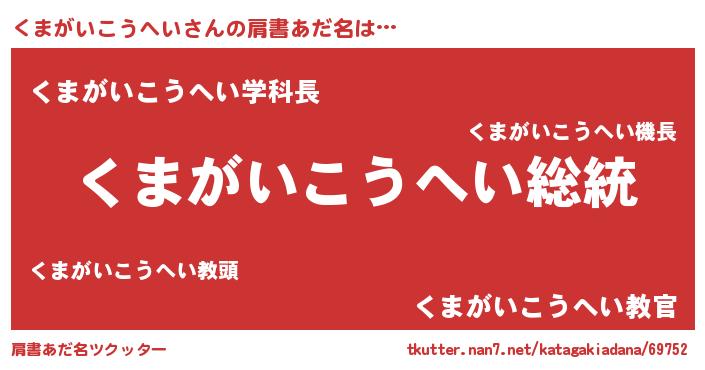 | 男性向けラノベタイトル風あだ名 | 『Re:くまがいこうへいから始める異世界生活』 |