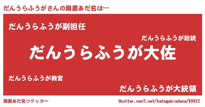 | 男性向けラノベタイトル風あだ名 | 『だんうらふうが~年齢イコール彼女いない歴の魔法使い~』 |