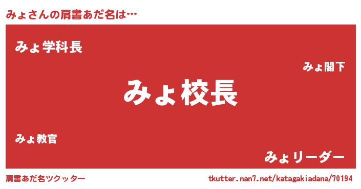 | 男性向けラノベタイトル風あだ名 | 『みょという概念が存在しない退屈な世界 』 |