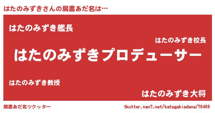 | 胡散臭い通販商品みたいなあだ名 | 『絶対に幸福をもたらす水素水…その名も「はたのみずき」』 |