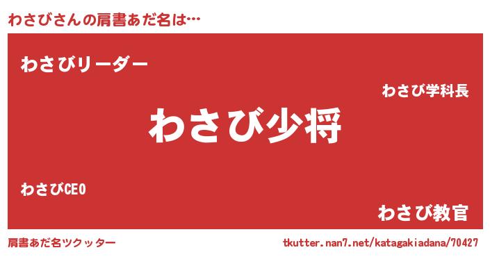 | 男性向けラノベタイトル風あだ名 | 『ワサビスレイヤー』『魔弾の王とわさび』 |