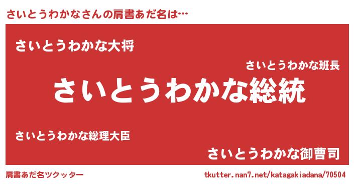 | 男性向けラノベタイトル風あだ名 | 『Re:さいとうわかなから始める異世界生活』 |