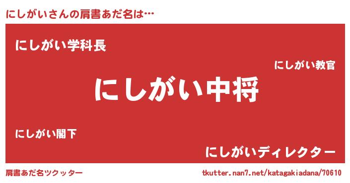 | 男性向けラノベタイトル風あだ名 | 『ニシガイスレイヤー』 |