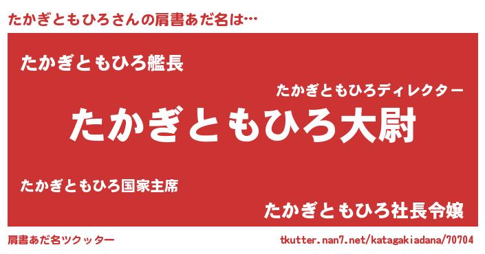 | 男性向けラノベタイトル風あだ名 | 『転生したらたかぎともひろだった件』 |