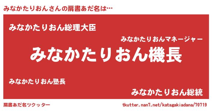 | 男性向けラノベタイトル風あだ名 | 『うちのみなかたりおんが世界を掌握している!』 |